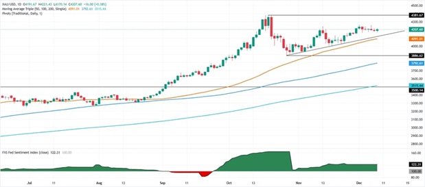 Valencia称,因此,金价的首个阻力位将是12月5日高点4259美元/盎司,其次是4300美元/盎司关口以及4381美元/盎司的历史高点。