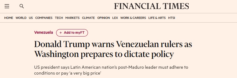英国《金融时报》报道称,特朗普向委内瑞拉目前事实上的领导人德尔西·罗德里格斯(Delcy Rodríguez)发出了严厉警告,称在尼古拉斯·马杜罗被捕之后,她必须满足美国的要求。与此同时,华盛顿释放信号,表明其意图是在加拉加斯“定调”政策,而不是对该国进行实际治理。